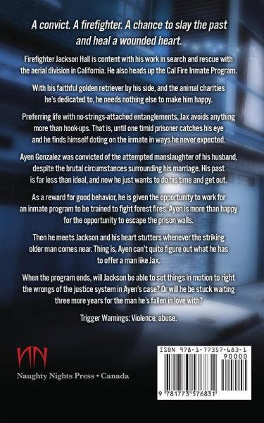 A convict. A firefighter. A chance to slay the past and heal a wounded heart. Firefighter Jackson Hall is content with his work in search and rescue with the aerial division in California. He also heads up the Cal Fire Inmate Program. With his faithful golden retriever by his side, and the animal charities he's dedicated to, he needs nothing else to make him happy. Preferring life with no-strings-attached entanglements, Jax avoids anything more than hook-ups. That is, until one timid prisoner catches his eye and he finds himself doting on the inmate in ways he never expected. Ayen Gonzalez was convicted of the attempted manslaughter of his husband, despite the brutal circumstances surrounding his marriage. His past is far less than ideal, and now he just wants to do his time and get out. As a reward for good behavior, he is given the opportunity to work for an inmate program to be trained to fight forest fires. Ayen is more than happy for the opportunity to escape the prison walls. Then he meets Jackson and his heart stutters whenever the striking older man comes near. Thing is, Ayen can't quite figure out what he has to offer a man like Jax. When the program ends, will Jackson be able to set things in motion to right the wrongs of the justice system in Ayen's case? Or will he be stuck waiting three more years for the man he's fallen in love with? Trigger Warnings: Violence, abuse.