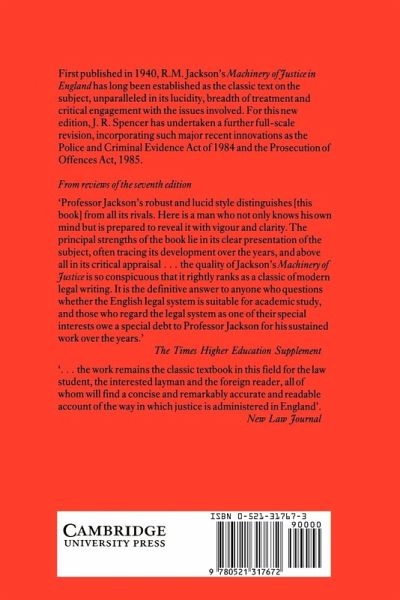 First published in 1940, R. M. Jackson's Machinery of Justice in England has long been established as the classic text on the subject, unparalleled in its lucidity, breadth of treatment and critical engagement with the issues involved. For this edition, J. R. Spencer has undertaken a further full-scale revision, incorporating such major topical innovations as the Police and Criminal Evidence Act of 1984 and the Prosecution of Offences Act, 1985.