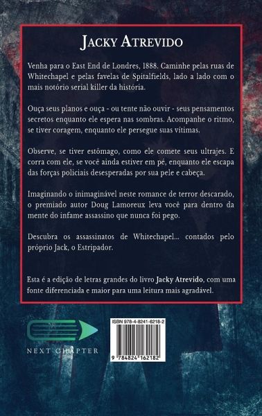 Venha para o East End de Londres, 1888. Caminhe pelas ruas de Whitechapel e pelas favelas de Spitalfields, lado a lado com o mais notório serial killer da história. Ouça seus planos e ouça - ou tente não ouvir - seus pensamentos secretos enquanto ele espera nas sombras. Acompanhe o ritmo, se tiver coragem, enquanto ele persegue suas vítimas. Observe, se tiver estômago, como ele comete seus ultrajes. E corra com ele, se você ainda estiver em pé, enquanto ele escapa das forças policiais desesperadas por sua pele e cabeça. Imaginando o inimaginável neste romance de terror descarado, o premiado autor Doug Lamoreux leva você para dentro da mente do infame assassino que nunca foi pego. Descubra os assassinatos de Whitechapel... contados pelo próprio Jack, o Estripador. Esta é a edição de letras grandes do livro Jacky Atrevido, com uma fonte diferenciada e maior para uma leitura mais agradável.