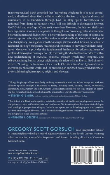 In retrospect, Karl Barth conceded that "everything which needs to be said, considered, and believed about God the Father and God the Son . . . might be shown and illuminated in its foundation through God the Holy Spirit." Nevertheless, he refrained from doing so because it was "still too difficult to distinguish between God's Spirit and man's spirit," and so it was--then. However, the late twentieth-century explosion in various disciplines of thought now provides greater discernment between human and divine spirit, a better understanding of the logic of spirit, and the concept and role of spirit in distinction to mind and body. Gorsuch's theological interdisciplinary investigation into the analogia spiritus and a Christian perichoretic relational ontology brings new meaning and coherence to previously difficult scriptures. Moreover, it provides the fundamental landscape for addressing issues of profound theological consequence: (1) redressing the death of transcendence with a new understanding of relational dynamics through which free, temporal, and self-determining human beings might mutually relate with an Eternal God of providence; (2) laying the framework for a viable Christian pluralistic hypothesis in an increasingly pluralistic world; and (3) providing an enriched theological anthropology for addressing human spirit, origins, and theodicy.
