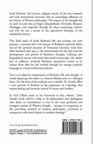 Jacob Boehme, the German religious mystic of the late sixteenth and early seventeenth centuries, had an astounding influence on the history of Western philosophy. The impact of his thought left its mark on such men as Hegel, Schopenhauer, Nietzsche, Bergson, Heidegger, and especially through his ideas concerning creation and evil, he was a power in the speculative theology of the nineteenth century. This fresh study of Jacob Boehme's life and writings not only presents a concrete and vivid picture of Boehme's personal affairs and of the spiritual situation of Protestant Germany more than three hundred years ago; it also demonstrates for the first time the development and growth of Boehme's thought. Utilizing new biographical sources and newly discovered manuscripts, the author has, in addition, analyzed Boehme's speculative system in its mature form after he had worked through his strange symbolic language to a more traditional synthesis. This is an objective examination of Boehme's life and thought. It avoids depicting him either as a heaven-blessed saint or a Baroque Faust. On the basis of the evidence now available, Dr. Stoudt offers a new portrait of Boehme as the proponent of a theology that stresses feeling and intuition instead of reason and intellect. As Paul Tillich states in his Foreword to this volume: ""John Stoudt's book will be a help to all philosophers and theologians who desire an introduction to one of the most profound and strangest systems of Western thought - strange in comparison to the prevailing method of modern philosophy, profound in comparison with much theism in modern theology.""