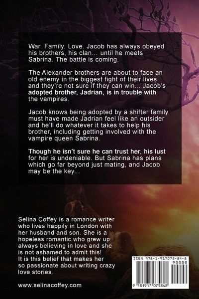 Enjoy this steamy shifter romance series by bestselling paranormal romance author Selina Coffey! War. Family. Love. Jacob has always obeyed his brothers, his clan... until he meets Sabrina. The battle is coming. The Alexander brothers are about to face an old enemy in the biggest fight of their lives and they're not sure if they can win... Jacob's adopted brother, Jadrian, is in trouble with the vampires. Jacob knows being adopted by a shifter family must have made Jadrian feel like an outsider and he'll do whatever it takes to help his brother, including getting involved with the vampire queen Sabrina. Though he isn't sure he can trust her, his lust for her is undeniable. But Sabrina has plans which go far beyond just mating, and Jacob may be the key... The books in this series: 1. Kane 2. Cade 3. Jacob Embark on an irresistible romance journey, where a powerful hunky shifter's fate intertwines with a captivating Vampire Queen! This steamy tale of love, passion, and vulnerability will keep you hooked until the very end. This smokin' hot book is perfect for fans of Anna Craig, Mandy M. Roth, Renee Rose, Vanessa Vale, Layla Nash. This is the large print version, created specifically for low-sight readers. Enjoy!