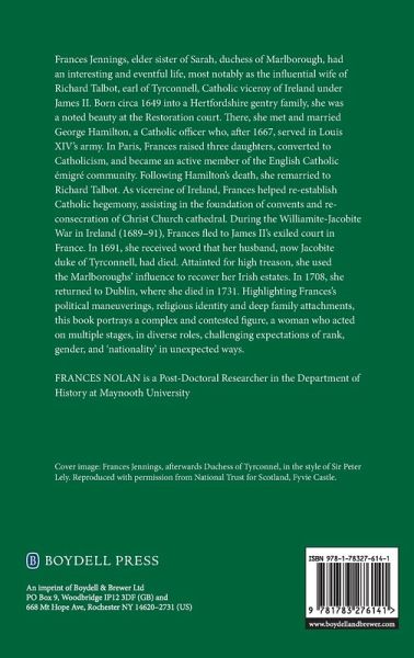Frances Jennings, elder sister of Sarah, duchess of Marlborough, had an interesting and eventful life, most notably as the influential wife of Richard Talbot, earl of Tyrconnell, Catholic viceroy of Ireland under James II. Born circa 1649 into a Hertfordshire gentry family, she was a noted beauty at the Restoration court. There, she met and married George Hamilton, a Catholic officer who, after 1667, served in Louis XIV's army. In Paris, Frances raised three daughters, converted to Catholicism, and became an active member of the English Catholic émigré community. Following Hamilton's death, she remarried to Richard Talbot. As vicereine of Ireland, Frances helped re-establish Catholic hegemony, assisting in the foundation of convents and re-consecration of Christ Church cathedral. During the Williamite-Jacobite War in Ireland (1689-91), Frances fled to James II's exiled court in France. In 1691, she received word that her husband, now Jacobite duke of Tyrconnell, had died. Attainted for high treason, she used the Marlboroughs' influence to recover her Irish estates. In 1708, she returned to Dublin, where she died in 1731. Highlighting Frances's political manoeuvrings, religious identity and deep family attachments, this book portrays a complex and contested figure, a woman who acted on multiple stages, in diverse roles, challenging expectations of rank, gender, and 'nationality' in unexpected ways.