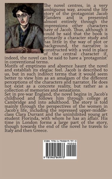 The story is told mainly through the perspectives of the women in Jacob's life, including the repressed upper-middle-class Clara Durrant and the uninhibited young art student Florinda, with whom he has an affair. His time in London forms a large part of the story, though towards the end of the novel he travels to Italy and then Greece. The novel centres, in a very ambiguous way, around the life story of the protagonist Jacob Flanders and is presented almost entirely through the impressions other characters have of Jacob. Thus, although it could be said that the book is primarily a character study and has little in the way of plot or background, the narrative is constructed with a void in place of the central character if, indeed, the novel can be said to have a 'protagonist' in conventional terms. Motifs of emptiness and absence haunt the novel and establish its elegiac feel. Jacob is described to us, but in such indirect terms that it would seem better to view him as an amalgam of the different perceptions of the characters and narrator. He does not exist as a concrete reality, but rather as a collection of memories and sensations. Motifs of emptiness and absence haunt the novel and establish its elegiac feel. Jacob is described to us, but in such indirect terms that it would seem better to view him as an amalgam of the different perceptions of the characters and narrator. He does not exist as a concrete reality, but rather as a collection of memories and sensations.