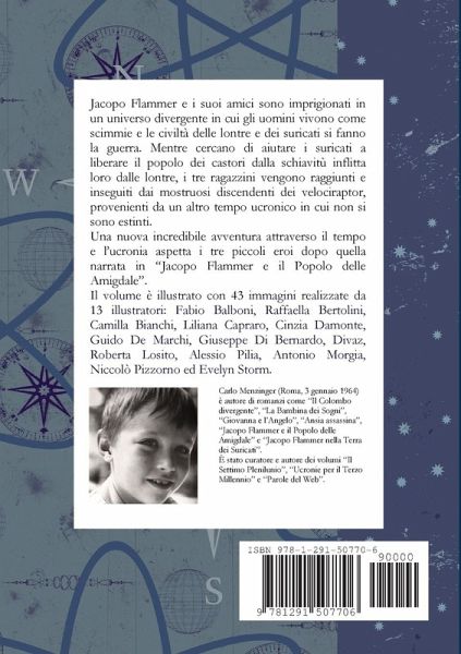 Jacopo Flammer e i suoi amici sono imprigionati in un universo divergente in cui gli uomini vivono come scimmie e le civiltà delle lontre e dei suricati si fanno la guerra. Mentre cercano di aiutare i suricati a liberare il popolo dei castori dalla schiavitù inflitta loro dalle lontre, i tre ragazzini vengono raggiunti e inseguiti dai mostruosi discendenti dei velociraptor, provenienti da un altro tempo ucronico in cui non si sono estinti. Una nuova incredibile avventura attraverso il tempo e l'ucronia aspetta i tre piccoli eroi dopo quella narrata in "Jacopo Flammer e il Popolo delle Amigdale". Il volume è illustrato con 43 immagini realizzate da 13 illustratori: Fabio Balboni, Raffaella Bertolini, Camilla Bianchi, Liliana Capraro, Cinzia Damonte, Guido De Marchi, Giuseppe Di Bernardo, Divaz, Roberta Losito, Alessio Pilia, Antonio Morgia, Niccolò Pizzorno ed Evelyn Storm.