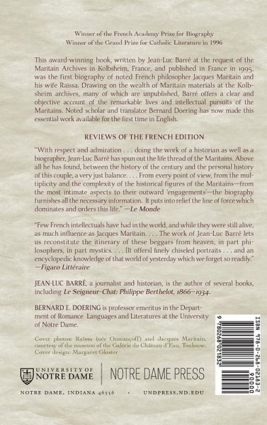 This award-winning book, written by Jean-Luc Barré at the request of the Maritain Archives in Kolbsheim, France, and published in France in 1995, was the first biography of noted French philosopher Jacques Maritain and his wife Raïssa. Drawing on the wealth of Maritain materials at the Kolbsheim archives, many of which are unpublished, Barré offers a clear and objective account of the remarkable lives and intellectual pursuits of the Maritains. Noted scholar and translator Bernard Doering has now made this essential work available for the first time in English. Jacques and Raïssa Maritain: Beggars for Heaven focuses not only on the Maritains' philosophical work, but also on their pursuit of social justice, their opposition to the Vichy, their battle against intellectual repression in the church, and their contemplative life of prayer and devotion. Barré places a particular emphasis on the Maritains' close and supportive friendships with novelists, poets, painters, and musicians who were considered revolutionary at the time. Doering's translation will appeal not only to scholars but also to anyone interested in intellectual history generally and the intellectual history of modern Catholicism in particular.