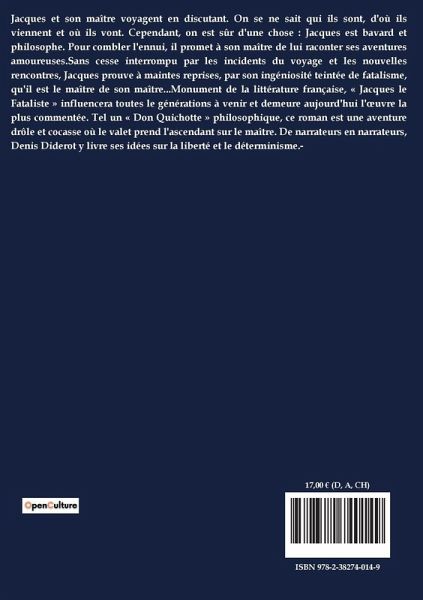 Jacques et son maître voyagent en discutant. On se ne sait qui ils sont, d'où ils viennent et où ils vont. Cependant, on est sûr d'une chose : Jacques est bavard et philosophe. Pour combler l'ennui, il promet à son maître de lui raconter ses aventures amoureuses.Sans cesse interrompu par les incidents du voyage et les nouvelles rencontres, Jacques prouve à maintes reprises, par son ingéniosité teintée de fatalisme, qu'il est le maître de son maître...Monument de la littérature française, « Jacques le Fataliste » influencera toutes le générations à venir et demeure aujourd'hui l'¿uvre la plus commentée. Tel un « Don Quichotte » philosophique, ce roman est une aventure drôle et cocasse où le valet prend l'ascendant sur le maître. De narrateurs en narrateurs, Denis Diderot y livre ses idées sur la liberté et le déterminisme.-