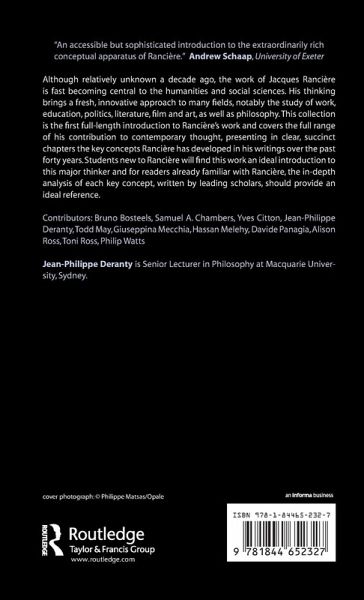 Although relatively unknown a decade ago, the work of Jacques Ranciere is fast becoming a central reference in the humanities and social sciences. His thinking brings a fresh, innovative approach to many fields, notably the study of work, education, politics, literature, film, art, as well as philosophy. This is the first, full-length introduction to Ranciere's work and covers the full range of his contribution to contemporary thought, presenting in clear, succinct chapters the key concepts Ranciere has developed in his writings over the last forty years. Students new to Ranciere will find this work accessible and comprehensive, an ideal introduction to this major thinker. For readers already familiar with Ranciere, the in-depth analysis of each key concept, written by leading scholars, should provide an ideal reference.