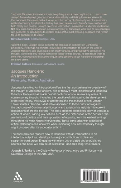 Jacques Rancière: An Introduction offers the first comprehensive introduction to the thought of one of today's most important and influential theorists. Joseph Tanke situates Rancière's distinctive approach against the backdrop of Continental philosophy and extends his insights into current discussions of art and politics. Tanke explains how Rancière's ideas allow us to understand art as having a deeper social role than is customarily assigned to it, as well as how political opposition can be revitalized. The book presents Rancière's body of work as a coherent whole, tracing key notions such as the distribution of the sensible, the aesthetics of politics, and the supposition of equality from his earliest writings through to his most recent interventions. Tanke concludes with a series of critical questions for Rancière's work, indicating how contemporary thought might proceed after its encounter with him. The book provides readers new to Rancière with a clear overview of his enormous intellectual output. Engaging with many un-translated and unpublished sources, the book will also be of interest to Rancière's long-time readers.