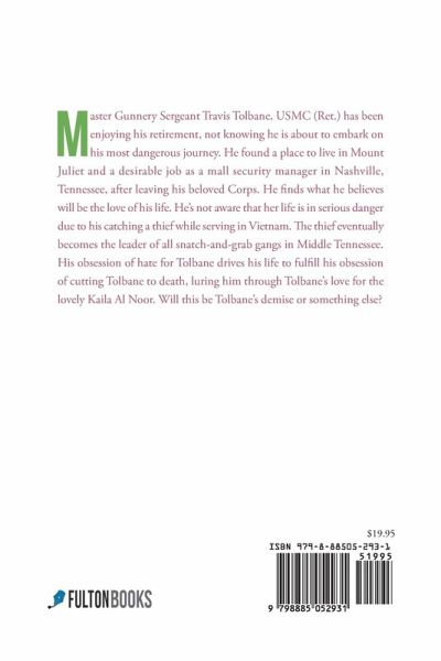 Master Gunnery Sergeant Travis Tolbane, USMC (Ret.) has been enjoying his retirement, not knowing he is about to embark on his most dangerous journey. He found a place to live in Mount Juliet and a desirable job as a mall security manager in Nashville, Tennessee, after leaving his beloved Corps. He finds what he believes will be the love of his life. He's not aware that her life is in serious danger due to his catching a thief while serving in Vietnam. The thief eventually becomes the leader of all snatch-and-grab gangs in Middle Tennessee. His obsession of hate for Tolbane drives his life to fulfill his obsession of cutting Tolbane to death, luring him through Tolbane's love for the lovely Kaila Al Noor. Will this be Tolbane's demise or something else?