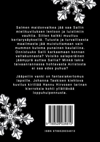 On talvi ja meri on vihdoinkin jäässä. Salmen maidonvalkea jää saa Sallin mielikuvituksen lentoon ja luistimiin vauhtia. Sitten kaikki muuttuu kertarysäyksellä. Tutusta ja turvallisesta maailmasta jää muistuttamaan vain mummon kutoma punainen kaulaliina. Onnistuuko Salli karkaamaan konnan valtakunnasta? Voisiko salaperäinen jäämyyrä auttaa Sallia? Minkä takia taivaanrannassa hohtavasta Airistosta ei saa edes puhua? Jääpeilin vanki on fantasiakertomus lapsille. Johanna Taskisen kiehtova kuvitus kirittää Hannu Hirvosen tarinan kierroksia kohti yllättävää loppuhuipennusta. Suurikokoinen teksti ja lyhyehköt luvut tekevät tarinasta palkitsevaa luettavaa myös aloittelevalle lukijalle. Johanna Taskisen koko sivun tai aukeaman kuvat avaavat fantasiaa ja satua sekoittavaan tarinaan uusia tasoja. Omimmillaan Jääpeilin vanki on kouluikäisille. Kokeneemmat lukijat löytävät tarinasta omat koukkunsa ja piikkinsä. Sadun, unen ja fantasian sekoituksena Jääpeilin vanki on tiukasti tässä ajassa kiinni. Jääpeilin vanki on VaLas -kirja, julkaistu VaLas-kollektiivin avustuksella.