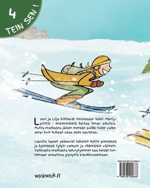 Lauri ja Lilja hiihtävät innoissaan kohti Mäntypirttiä - ensimmäistä kertaa ilman aikuisia. Mutta matkasta jäisen metsän poikki tulee vaikeampi kuin kukaan osaa edes aavistaa. Lopulta lapset pääsevät takaisin kotiin pimeässä ja kylmässä tyhjin vatsoin ja rikkinäisin välinein. Vaikeasta matkasta selviytyminen saa heidät tuntemaan ansaittua ylpeyttä sisukkuudestaan. ---- Liam and Lily are excited to ski through the woods to Pine Cottage for the first time without adults. But the trip is much harder than they expect. Eventually they make it home in the dark and cold, with empty stomachs and broken gear. But they are full of pride over their courage during the difficult trip.