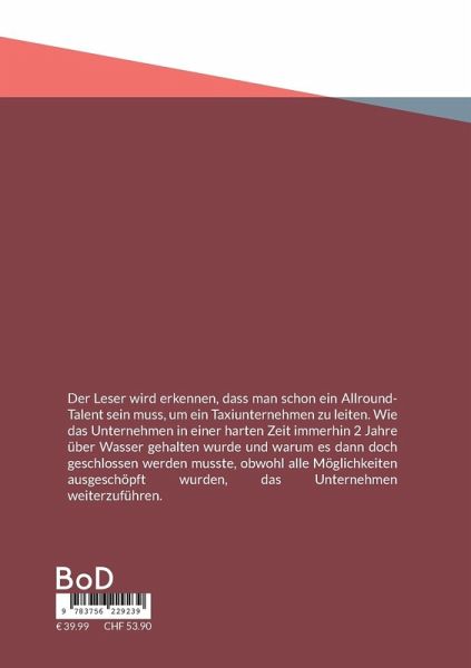 Der Leser wird erkennen, dass man schon ein Allround-Talent sein muss, um ein Taxiunternehmen zu leiten. Wie das Unternehmen in einer harten Zeit immerhin 2 Jahre über Wasser gehalten wurde und warum es dann doch geschlossen werden musste, obwohl alle Möglichkeiten ausgeschöpft wurden, das Unternehmen weiterzuführen.