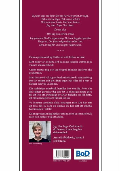 Denna prosasamling föddes ur mitt behov av tröst. Mitt behov av att sätta ord på mina känslor utifrån min vuxnes sons missbruk. Orden tröstar mig och jag hoppas att mina ord även ska ge dig tröst. Med dessa ord vill jag att du ska förstå att du som anhörig inte är ensam och det finns inget rätt eller fel i hur vi känner och vad vi känner. Din anhöriges missbruk handlar inte om dig. Även om det såklart påverkar dig och det vi anhöriga måste göra för att leva ett anständigt liv är att förhålla oss till detta, att hitta strategier som funkar för oss. Vi kommer använda olika strategier men Du har rätt att leva ditt liv som du önskar, du har rätt att inneha huvudrollen i ditt liv. Denna prosasamling hjälper inte min son ur sitt missbruk men den hjälper mig att andas.