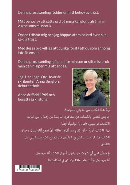 Denna prosasamling föddes ur mitt behov av tröst. Mitt behov av att sätta ord på mina känslor utifrån min vuxne sons missbruk. Orden tröstar mig och jag hoppas att mina ord även ska ge dig tröst. Orden skrevs inledningsvis på svenska och finns nu i denna version både på svenska och arabiska. Med dessa ord vill jag att du ska förstå att du som anhörig inte är ensam och det finns inget rätt eller fel i hur vi känner och vad vi känner. Din anhöriges missbruk handlar inte om dig. Även om det såklart påverkar dig och det vi anhöriga måste göra för att leva ett anständigt liv är att förhålla oss till detta, att hitta strategier som funkar för oss. Vi kommer använda olika strategier men Du har rätt att leva ditt liv som du önskar, du har rätt att inneha huvudrollen i ditt liv. Denna prosasamling hjälper inte min son ur sitt missbruk men den hjälper mig att andas. وُلِدَ هذا الديوان من حاجتي للمواساة. حاجتي للتعبير بالكلمات عن مشاعري الناجمة من إدمان ابني البالغ. الكلماتُ تواسيني، وآمل أن تواسيكَ أيضًا. بهذا الديوان، أريدُ منكَ، كفردٍ من أفراد العائلة، أنْ تفهم أنّك لستَ وحدك.