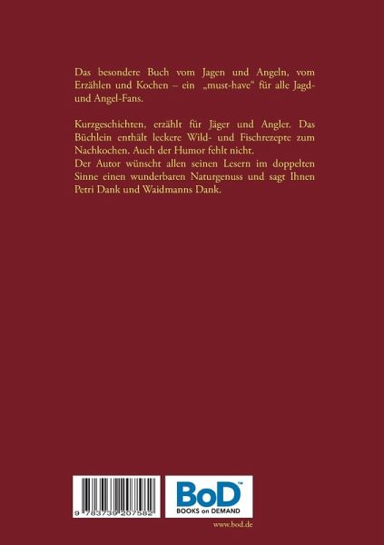 Das besondere Buch vom Jagen und Angeln, vom Erzählen und Kochen - ein "must-have" für alle Jagd- und Angel-Fans.Kurzgeschichten, erzählt für Jäger und Angler. Das Büchlein enthält leckere Wild- und Fischrezepte zum Nachkochen. Auch der Humor fehlt nicht. Der Autor wünscht allen seinen Lesern im doppelten Sinne einen wunderbaren Naturgenuss und sagt Ihnen Petri Dank und Waidmanns Dank.