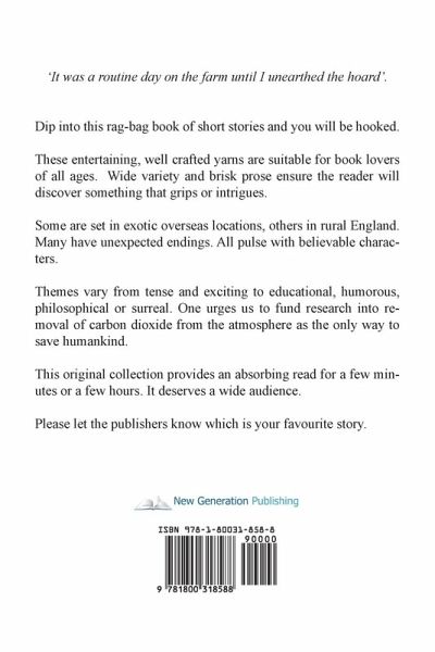 It was a routine day on the farm until I unearthed the hoard' Dip into this rag-bag book of short stories and you will be hooked. These entertaining, well crafted yarns are suitable for book lovers of all ages. Wide variety and brisk prose ensure the reader will discover something that grips or intrigues. Some are set in exotic overseas locations, others in rural England. Many have unexpected endings. All pulse with believable characters. Themes vary from tense and exciting to educational, humorous, philosophical or surreal. One urges us to fund research into removal of carbon dioxide from the atmosphere as the only way to save humankind. This original collection provides an absorbing read for a few minutes or a few hours. It deserves a wide audience. Please let the publishers know which is your favourite story.