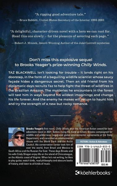Named a finalist for the 2023 American Fiction Award: Adventure. Don't miss this explosive sequel to Brooks Yeager's prize-winning Chilly Winds. Taz Blackwell isn't looking for trouble - it lands right on his doorstep, in the form of a beguiling wildlife scientist whose saucy façade hides a dangerous secret. Then an old friend from his diplomatic days recruits Taz to help fight the threat of wildfires in the Brazilian Amazon. The mysteries he encounters in the forest will test him in ways beyond his wildest imaginings and change his life forever. And the enemy he makes will return to haunt him and try the strength of a new but rocky romance.