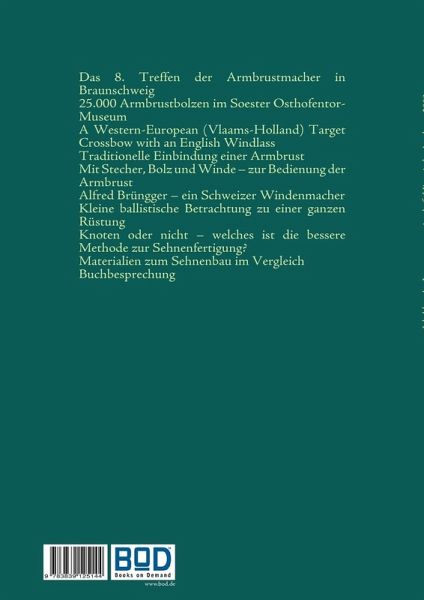 Das 8. Treffen der Armbrustmacher in Braunschweig vom 10. bis 12. Juli 200925.000 Armbrustbolzen im Soester Osthofentor-MuseumA Western-European (Vlaams-Holland) Target Crossbow with an English WindlassTraditionelle Einbindung einer ArmbrustMit Stecher, Bolz und Winde - zur Bedienung der ArmbrustAlfred Brüngger - ein Schweizer WindenmacherKleine ballistische Betrachtung zu einer ganzen RüstungKnoten oder nicht - welches ist die bessere Methode zur Sehnenfertigung?Materialien zum Sehnenbau im VergleichBuchbesprechung
