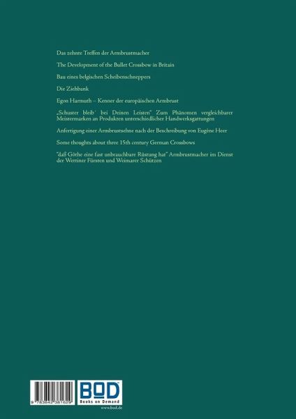 Das zehnte Treffen der ArmbrustmacherThe Development of the Bullet Crossbow in BritainBau eines belgischen ScheibenschneppersDie ZiehbankEgon Harmuth - Kenner der europäischen Armbrust"Schuster bleib´ bei Deinen Leisten" Zum Phänomen vergleichbarer Meistermarken an Produkten unterschiedlicher HandwerksgattungenAnfertigung einer Armbrustsehne nach der Beschreibung von Eugène HeerSome thoughts about three 15th century German Crossbows"daß Göthe eine fast unbrauchbare Rüstung hat" Armbrustmacher im Dienst der Wettiner Fürsten und Weimarer Schützen
