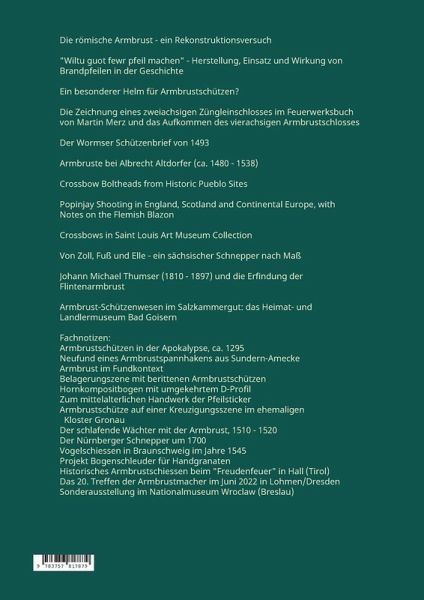 Die römische Armbrust - ein Rekonstruktionsversuch"Wiltu guot fewr pfeil machen" - Herstellung, Einsatz und Wirkung von Brandpfeilen in der GeschichteEin besonderer Helm für Armbrustschützen?Die Zeichnung eines zweiachsigen Züngleinschlosses im Feuerwerksbuch von Martin Merz und das Aufkommen des vierachsigen ArmbrustschlossesDer Wormser Schützenbrief von 1493Armbruste bei Albrecht Altdorfer (ca. 1480 - 1538)Crossbow Boltheads from Historic Pueblo SitesPopinjay Shooting in England, Scotland and Continental Europe, with Notes on the Flemish BlazonCrossbows in Saint Louis Art Museum CollectionVon Zoll, Fuß und Elle - ein sächsischer Schnepper nach MaßJohann Michael Thumser (1810 - 1897) und die Erfindung der FlintenarmbrustArmbrust-Schützenwesen im Salzkammergut: das Heimat- und Landlermuseum Bad GoisernFachnotizen:Armbrustschützen in der Apokalypse, ca. 1295Neufund eines Armbrustspannhakens aus Sundern-AmeckeArmbrust im FundkontextBelagerungszene mit berittenen ArmbrustschützenHornkompositbogen mit umgekehrtem D-ProfilZum mittelalterlichen Handwerk der PfeilstickerArmbrustschütze auf einer Kreuzigungsszene im ehemaligen Kloster GronauDer schlafende Wächter mit der Armbrust, 1510 - 1520Der Nürnberger Schnepper um 1700Vogelschiessen in Braunschweig im Jahre 1545Projekt Bogenschleuder für HandgranatenHistorisches Armbrustschiessen beim "Freudenfeuer" in Hall (Tirol)Das 20. Treffen der Armbrustmacher im Juni 2022 in Lohmen/DresdenSonderausstellung im Nationalmuseum Wroclaw (Breslau)