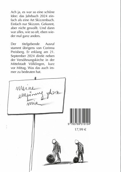 Ach ja, es war so eine schöne Idee: das Jahrbuch 2024 einfach als eine Art Skizzenbuch. Einfach nur Skizzen. Gekonnt, aber nicht gewollt. Und dann war alles, wie so oft, eben wieder mal ganz anders. Der titelgebende Ausruf stammt übrigens von Corinna Preisberg. Er erklang am 21. September direkt neben der Versöhnungskirche in der Mittelstadt Völklingen, kurz vor Mittag. Was das auch immer zu bedeuten hat.