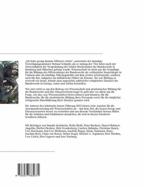¿Ich habe genug dumme Offiziere erlebt¿, antwortete der damalige Verteidigungsminister Helmut Schmidt, als er Anfang der 70er Jahre nach der Notwendigkeit der Neugründung der beiden Hochschulen der Bundeswehr in Hamburg und München gefragt wurde. Wissenschaft ist nicht nur die Grundlage für die Bildung des Offizierskorps der Bundeswehr als verlässliche Staatsbürger in Uniform oder als künftige Führungskräfte auf dem zivilen Arbeitsmarkt, sondern auch für ihre Aufgaben als militärische Führer im Einsatz. Nie war Bildung so wertvoll wie heute, könnte man angesichts zahlreicher zeitgleicher Einsätze der Bundeswehr in Europa, Asien und Afrika feststellen. Wie aber steht es um den Beitrag von Wissenschaft und akademischer Bildung für die Bundeswehr und ihre Einsatzorientierung? Es geht hier vor allem um die Frage, wie das, was Wissenschaften bieten können und könnten, für die Bundeswehr, für die akademische Bildung ihres Personals sowie für die möglichst erfolgreiche Durchführung ihrer Einsätze genutzt wird. Die Autoren des Jahrbuchs Innere Führung 2013 bieten viele Aspekte für die Auseinandersetzung mit Wissenschaften an ¿ mit dem Ziel, die neuen Kriege und Einsatzszenarien besser zu verstehen und aus diesem Verständnis heraus Hilfen für die Soldaten und Soldatinnen abzuleiten, die sich in diesen Einsätzen bewähren müssen. Mit Beiträgen von Donald Abenheim, Heiko Biehl, Peter Buchner, Marcel Bohnert, Angelika Dörfler-Dierken, Dirk Freudenberg, Carolyn Halladay, Christian Hauck, Uwe Hartmann, Kai-Uwe Hellmann, Joachim Hoppe, Klaus Naumann, Hans-Joachim Reeb, Claus von Rosen, Stefan Siegel, Michael A. Tegtmeier, Jörn Thießen, Uwe Ulrich, Jörn Ungerer, Jens Warburg.