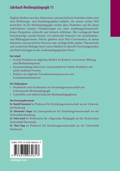 Digitale Medien und ihre diskursiven und produktiven Praktiken haben eine neue Erfahrungs- und Handlungssphäre etabliert, die unsere soziale Welt anreichert. In der Medienpädagogik werden diese Praktiken und die damit verbundenen sozialen Veränderungen aus einer erziehungswissenschaftlichen Perspektive erforscht und kritisch reflektiert. Der vorliegende Band berücksichtigt sowohl formale wie informelle Kontexte von Sozialisations- und Bildungsprozessen. Hierzu gehören auch Netz-Communitys, in denen diskursive und produktive Prozesse eine wichtige Rolle spielen. Theoretische und empirische Beiträge bieten einen Einblick in aktuelle Forschungsansätze und Entwicklungen in der medienpädagogischen Praxis.