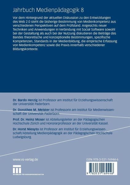 Dr. Bardo Herzig ist Professor am Institut für Erziehungswissenschaft der Universität Paderborn. Dr. Dorothee M. Meister ist Professorin am Institut für Medienwissenschaft der Universität Paderborn. Prof. Dr. Heinz Moser ist Abteilungsleiter an der Pädagogischen Hochschule Zürich und Honorarprofessor an der Universität Kassel. Dr. Horst Niesyto ist Professor am Institut für Erziehungswissenschaft/Abteilung Medienpädagogik an der Pädagogischen Hochschule Ludwigsburg.