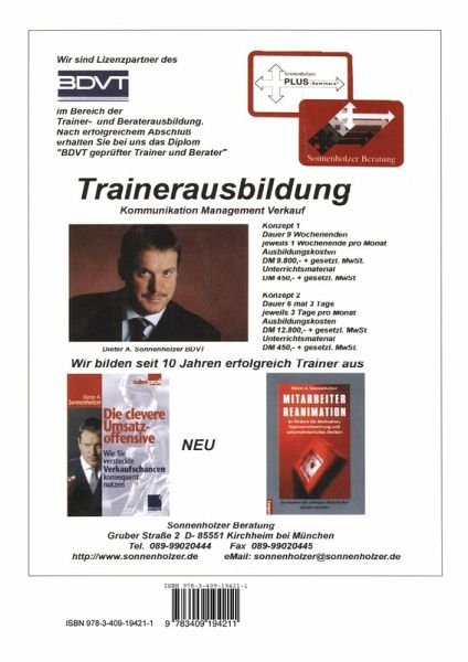 Immer up-to-date in der Verkäuferweiterbildung! Als Wachstumsmarkt der beruflichen Bildung muss sich das Verkaufstraining an den Bedürfnissen und Erwartungen der zu schulenden Teilnehmer orientieren. Das Jahrbuch bietet konkrete Trainings-Know-how sowie ein umfassendes Anbieterverzeichnis.