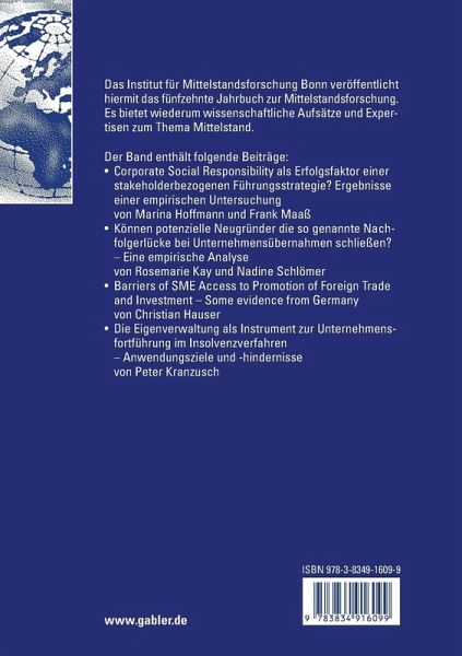 Das Institut für Mittelstandsforschung Bonn veröffentlicht hiermit das fünfzehnte Jahrbuch zur Mittelstandsforschung. Es bietet wiederum wissenschaftliche Aufsätze und Expertisen zum Thema Mittelstand.