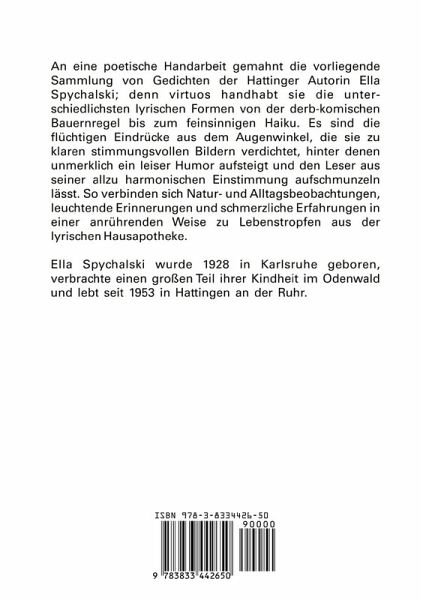 An eine poetische Handarbeit gemahnt die vorliegende Sammlung von Gedichten der Hattinger Autorin Ella Spychalski; denn virtuos handhabt sie die unterschiedlichsten lyrischen Formen von der derb-komischen Bauernregel bis zum feinsinnigen Haiku. Es sind die flüchtigen Eindrücke aus dem Augenwinkel, die sie zu klaren stimmungsvollen Bildern verdichtet, hinter denen unmerklich ein leiser Humor aufsteigt und den Leser aus seiner allzu harmonischen Einstimmung aufschmunzeln lässt. So verbinden sich Natur- und Alltagsbeobachtungen, leuchtende Erinnerungen und schmerzliche Erfahrungen in einer anrührenden Weise zu Lebenstropfen aus der lyrischen Hausapotheke.