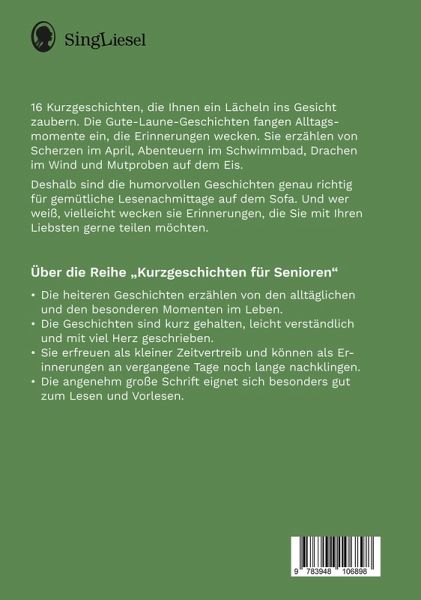 16 Kurzgeschichten, die Ihnen ein Lächeln ins Gesicht zaubern.Die Gute-Laune-Geschichten fangen Alltagsmomente ein, die Erinnerungen wecken. Sie erzählen von Scherzen im April, Abenteuern im Schwimmbad, Drachen im Wind und Mutproben auf dem Eis.