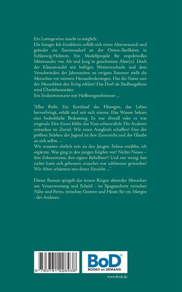 Ein Lottogewinn macht es möglich. Die betagte Ich-Erzählerin erfüllt sich einen Alterswunsch und gründet ein Seniorendorf an der Ostsee-Steilküste in Schleswig-Holstein. Ein Modellprojekt für respektvolles Miteinander von Alt und Jung in gesichertem Alter(n). Doch der Klimawandel mit heftigen Wetterwechseln und dem Verschwinden der Jahreszeiten zu ewigem Sommer stellt die Menschen vor extreme Herausforderungen. Hat die Natur nun der Menschheit den Krieg erklärt? Das Dorf als Siedlungsform wird Überlebensstätte. Ein Endzeitszenario mit Hoffnungsschimmer ..."Alles fließt. Ein Kreislauf des Flüssigen, das Leben hervorbringt, erhält und mit sich nimmt. Das Wasser bekam eine bedrohliche Bedeutung. Es war überall oder es war nirgends. Den einen fehlte das Nass schmerzlich. Die anderen ertranken im Zuviel. Wie einen Ausgleich schaffen? Eine der größten Stärken der Jugend ist ihre Zuversicht und der Glaube an sich selbst. ... Wir mussten ehrlich sein zu den Jungen. Selma erzählte, ich ergänzte. Was ging in den jungen Köpfen vor? Nichts Neues - ihre Erkenntnisse, ihre eigene Rebellion?! Und nur wenig, fast nichts hatte sich gebessert, manches war schlimmer geworden! Wir Alten schämten uns dieser Einsicht. ..." Dieser Roman spiegelt das innere Ringen alternder Menschen um Verantwortung und Schuld - im Spagatschritt zwischen Nähe und Ferne, zwischen Gestern und Heute für ein Morgen - der Anderen.