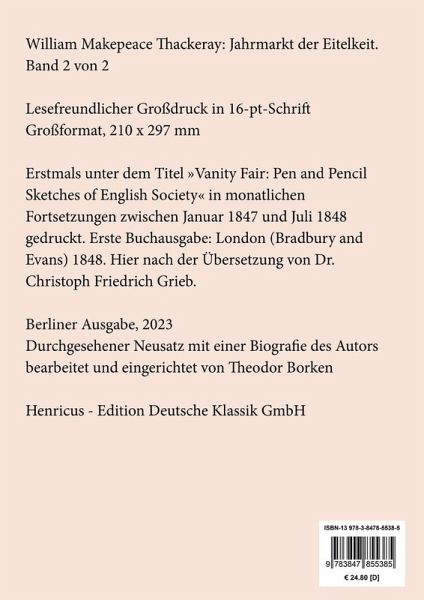 William Makepeace Thackeray: Jahrmarkt der Eitelkeit. Band 2 von 2Lesefreundlicher Großdruck in 16-pt-SchriftGroßformat, 210 x 297 mmBerliner Ausgabe, 2023Durchgesehener Neusatz mit einer Biografie des Autors bearbeitet und eingerichtet von Theodor BorkenErstmals unter dem Titel »Vanity Fair: Pen and Pencil Sketches of English Society« in monatlichen Fortsetzungen zwischen Januar 1847 und Juli 1848 gedruckt. Erste Buchausgabe: London (Bradbury and Evans) 1848. Hier nach der Übersetzung von Dr. Christoph Friedrich Grieb.Textgrundlage sind die Ausgaben:Thackeray, William Makepeace: Jahrmarkt der Eitelkeit. 2 Bände, übers. v. Dr. Chr. Fr. Grieb, Berlin: Rütten & Loening, 1964.Umschlagabbildung: Frank Dicksee, Der Spiegel, 1896Gesetzt aus der Minion Pro, 16 pt.Henricus - Edition Deutsche Klassik GmbH