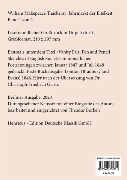 William Makepeace Thackeray: Jahrmarkt der Eitelkeit. Band 1 von 2Lesefreundlicher Großdruck in 16-pt-SchriftGroßformat, 210 x 297 mmBerliner Ausgabe, 2023Durchgesehener Neusatz mit einer Biografie des Autors bearbeitet und eingerichtet von Theodor BorkenErstmals unter dem Titel »Vanity Fair: Pen and Pencil Sketches of English Society« in monatlichen Fortsetzungen zwischen Januar 1847 und Juli 1848 gedruckt. Erste Buchausgabe: London (Bradbury and Evans) 1848. Hier nach der Übersetzung von Dr. Christoph Friedrich Grieb.Textgrundlage ist die Ausgabe:Thackeray, William Makepeace: Jahrmarkt der Eitelkeit. 2 Bände, übers. v. Dr. Chr. Fr. Grieb, Berlin: Rütten & Loening, 1964.Umschlagabbildung: Frank Dicksee, Der Spiegel, 1896Gesetzt aus der Minion Pro, 16 pt.Henricus - Edition Deutsche Klassik GmbH