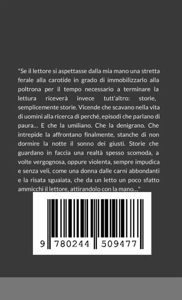 Se il lettore si aspettasse dalla mia mano una stretta ferale alla carotide in grado di immobilizzarlo alla poltrona per il tempo necessario a terminare la lettura riceverà invece tutt'altro: storie, semplicemente storie. Vicende che scavano nella vita di uomini alla ricerca di perché, episodi che parlano di paura... E che la umiliano. Che la denigrano. Che intrepide la affrontano finalmente, stanche di non dormire la notte il sonno dei giusti. Storie che guardano in faccia una realtà spesso scomoda, a volte vergognosa, oppure violenta, sempre impudica e senza veli, come una donna dalle carni abbondanti e la risata sguaiata, che da un letto un poco sfatto ammicchi il lettore, attirandolo con la mano... dall'introduzione dell'autore