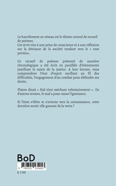 Le harcèlement en réseau(x) est le thème central de ce recueil de poèmes. Cet écrit vise à une prise de conscience et à une réflexion collective sur la déviance de la société dans laquelle on tend vers le « tout permis ». Les poèmes présentés de manière chronologique sont mon témoignage. Il ont été écrits en parallèle des événements survenus justifiant la saisie des tribunaux judiciaires. A leur lecture, vous comprendrez l'état d'esprit oscillant au fil des difficultés, l'engagement d'un combat et les raisons du traitement de faveur qui m'a été réservée. Platon disait : "Nul n'est méchant volontairement". En d'autres termes, le mal a pour cause l'ignorance. Si l'âme s'élève et s'oriente vers la connaissance, cette dernière serait-elle garante de la vertu? ...