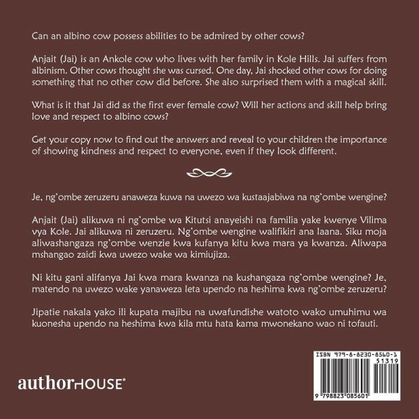 Can an albino cow possess abilities to be admired by other cows? Anjait (Jai) is an Ankole cow who lives with her family in Kole Hills. Jai suffers from albinism. Other cows thought she was cursed. One day, Jai shocked other cows for doing something that no other cow did before. She also surprised them with a magical skill. What is it that Jai did as the first ever female cow? Will her actions and skill help bring love and respect to albino cows? Get your copy now to find out the answers and reveal to your children the importance of showing kindness and respect to everyone, even if they look different. Je, ng'ombe zeruzeru anaweza kuwa na uwezo wa kustaajabiwa na ng'ombe wengine? Anjait (Jai) alikuwa ni ng'ombe wa Kitutsi anayeishi na familia yake kwenye Vilima vya Kole. Jai alikuwa ni zeruzeru. Ng'ombe wengine walifikiri ana laana. Siku moja aliwashangaza ng'ombe wenzie kwa kufanya kitu kwa mara ya kwanza. Aliwapa mshangao zaidi kwa uwezo wake wa kimiujiza. Ni kitu gani alifanya Jai kwa mara kwanza na kushangaza ng'ombe wengine? Je, matendo na uwezo wake yanaweza leta upendo na heshima kwa ng'ombe zeruzeru? Jipatie nakala yako ili kupata majibu na uwafundishe watoto wako umuhimu wa kuonesha upendo na heshima kwa kila mtu hata kama mwonekano wao ni tofauti.