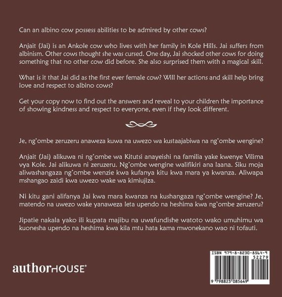 Can an albino cow possess abilities to be admired by other cows? Anjait (Jai) is an Ankole cow who lives with her family in Kole Hills. Jai suffers from albinism. Other cows thought she was cursed. One day, Jai shocked other cows for doing something that no other cow did before. She also surprised them with a magical skill. What is it that Jai did as the first ever female cow? Will her actions and skill help bring love and respect to albino cows? Get your copy now to find out the answers and reveal to your children the importance of showing kindness and respect to everyone, even if they look different. Je, ng'ombe zeruzeru anaweza kuwa na uwezo wa kustaajabiwa na ng'ombe wengine? Anjait (Jai) alikuwa ni ng'ombe wa Kitutsi anayeishi na familia yake kwenye Vilima vya Kole. Jai alikuwa ni zeruzeru. Ng'ombe wengine walifikiri ana laana. Siku moja aliwashangaza ng'ombe wenzie kwa kufanya kitu kwa mara ya kwanza. Aliwapa mshangao zaidi kwa uwezo wake wa kimiujiza. Ni kitu gani alifanya Jai kwa mara kwanza na kushangaza ng'ombe wengine? Je, matendo na uwezo wake yanaweza leta upendo na heshima kwa ng'ombe zeruzeru? Jipatie nakala yako ili kupata majibu na uwafundishe watoto wako umuhimu wa kuonesha upendo na heshima kwa kila mtu hata kama mwonekano wao ni tofauti.