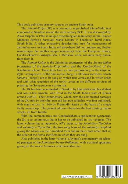 This book publishes primary sources on ancient South Asia. The Jaimini-Kalpa (JK) is a previouly unpublished Sama-Vedic text composed in Sanskrit around the sixth century BCE. It was discovered by Asko Parpola in 1966 in a unique miscatalogued manuscript in the Tanjore Maharaja Serfoji's Sarasvati Mahal Library in Thanjavur, Tamil Nadu, South India. A rather exhaustive decades-long hunt for manuscripts of Jaiminiya texts in South India and elsewhere did not produce any further manuscripts of this text; but another unique manuscript from the Thanjavur library, Candrasekhara's Prayoga-Vrtti, a Medieval work, contains many quotations from it. The Jaimini-Kalpa is the Jaiminiya counterpart of the Arseya-Kalpa of the Kauthuma school of Sama-Veda. These texts have as their purpose to give the kalpa or klpti 'arrangement' of the Sama-Vedic liturgy in all Soma sacrifices: which samans ('songs') are to be sung on which text verses and in which order and with what repetition of the stotra verses at the different services of pressing the Soma juice in a given rite. The JK has been commented in Sanskrit by Bhavatrata and his student and son-in-law Jayanta, who lived in the South Indian state of Kerala around 700 CE. Their commentary, which cites the commented passages of the bJK only by their first two and last two syllables, was first published, with many errors, in 1966 by Premnidhi Sastri on the basis of a single faulty manuscript. The present edition is based on the best existing manuscripts, all from Kerala. With the coomentaries and Candrasekhara's applications (prayoga), the JK is so voluminous that it has to be printed in two volumes. The latter volume has an appendix, AP's index to the Jaiminiya-Uha-Gana and Jaiminiya-Uhya-Gana, the two song books of the Jaiminiya-Samhita giving the samans in their modified form and in their ritual order, that is, the order of the Soma sacrifices in which they are sung. Also published in the latter volume is Jayanta's commentary on selected passages of the Jaiminiya-Arseya-Brahmana, with a critical apparatus giving all the variae lectiones of all available mss.