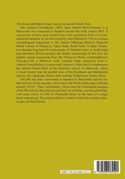 This book publishes primary sources on ancient South Asia. The Jaimini-Paryadhyaya (JPA) alias Jaimini-Sutra-Parisesa is a Samavedic text composed in Sanskrit around the sixth century BCE. It was known to have once existed from a few quotations from it in commentarial literature. It was discovered by Asko Parpola in 1966 in a unique miscatalogued manuscript in the Tanjore Maharaja Serfoji's Sarasvati Mahal Library in Thanjavur, Tamil Nadu, South India. A rather exhaustive decades-long hunt for manuscripts of Jaiminiya texts in South India and elsewhere did not produce any further manuscripts of this text; but another unique manuscript from the Thanjavur library, Candrasekhara's Prayoga-Vrtti, a Medieval work, contains many quotations from it. Jaimini-Paryadhyaya is a previously unknown Vedic text. It complements the Jaimini-Srauta-Sutra of the Jaiminiya school of Samaveda, which is much shorter than the parallel texts of the Kauthuma and Ranayaniya schools, the Latyayana-Srauta-Sutra and the Drahyayana-Srauta-Sutra. The JPA has been commented in Sanskrit by Bhavatrata and his student and son-in-law Jayanta, who lived in the South Indian state of Kerala around 700 CE. Their commentary, which cites the commented passages of the JPA only by their first two and last two syllables, was first published, with many errors, in 1966 by Premnidhi Sastri on the basis of a single faulty manuscript. The present edition is based on the best existing manuscripts, all from Kerala.
