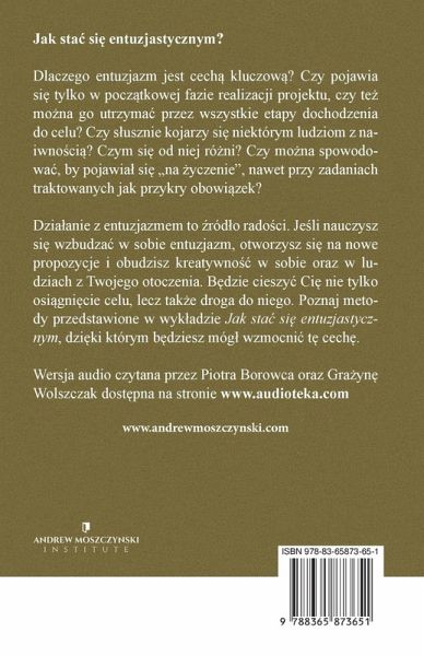 Dziäanie z entuzjazmem to ¿ród¿o radöci. Jednak radö¿ ¿ycia i nieskäona niczym wola, by natychmiast wcielä w ¿ycie inspiruj¿ce pomys¿y, jest g¿ównie domen¿ dzieci. Wielu doros¿ych ulega stereotypom i zatraca t¿ cech¿ pod naciskiem ¿rodowiska. Ale ¿ycie bez entuzjazmu na d¿üsz¿ met¿ okazuje si¿ bardzo smutne i trudne. Czy tak musi by¿? Entuzjazm pozwala otwierä si¿ na nowe propozycje i budzi¿ kreatywnö¿ w sobie oraz w ludziach z naszego otoczenia. Pozwala cieszy¿ si¿ nie tylko z osi¿gni¿cia celu, lecz tak¿e z drogi, która do niego prowadzi. Wyk¿ad przedstawia metody umöliwiaj¿ce rozwijanie i utrzymywanie entuzjazmu. Zwraca uwag¿ na znaczenie w tym procesie planowania i przygotowywania dziää. Opisuje, jak möna wzbudzi¿ w sobie kreatywnö¿ i wizjonerstwo. Podpowiada tak¿e, jak radzi¿ sobie ze zniech¿caniem ze strony innych, stresem i innymi przeszkodami, które potrafi¿ wygasi¿ nawet najwi¿kszy entuzjazm.