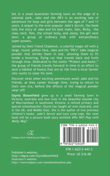 Set in a small Australian farming town on the edge of a national park, Jake and the PB's is an exciting tale of adventure for boys and girls between the ages of 7 and 11 years. A sequel to the ever-popular Jake's Secret, the book tells the story of Jake and his best mate, Sam, Ricky, the class nerd, Tom, the school bully, and Janey, the girl next door; a group of ordinary kids with extraordinary super-powers. Joined by their friend Chadwick, a colorful magic elf with a large, round, yellow face, Jake and his "PB's" take magical powder that shrinks them in size, allowing them to fit inside a hovering, flying car that travels back and forth through time. Dedicated to the motto "Protect and Assist," the group of friends travels forward in time in an effort to save a habitat of koalas that are at risk from a local farmer who wants to clear his land. Discover what other exciting adventures await Jake and his friends, as they career through time, trying to return to their own era, before the effects of the magical powder wear off! Glynis Bloomfield grew up in a small farming town in Victoria, Australia and now lives in the beautiful seaside city of Warrnambool in southwest Victoria. A retired primary and special schoolteacher, Glynis has taught all over Australia, and in the UK, and Middle East. She is the author of two previous children's books: Jake's Secret and Lara Long Legs. Her next book will be a picture book story entitled Who Will Play with Molly May? Publisher's website: http://sbpra.com/GlynisBloomfield