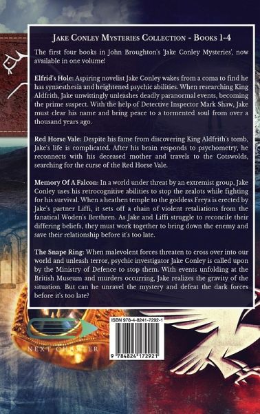 The first four books in John Broughton's 'Jake Conley Mysteries', now available in one volume! Elfrid's Hole: Aspiring novelist Jake Conley wakes from a coma to find he has synaesthesia and heightened psychic abilities. When researching King Aldfrith, Jake unwittingly unleashes deadly paranormal events, becoming the prime suspect. With the help of Detective Inspector Mark Shaw, Jake must clear his name and bring peace to a tormented soul from over a thousand years ago. Red Horse Vale: Despite his fame from discovering King Aldfrith's tomb, Jake's life is complicated. After his brain responds to psychometry, he reconnects with his deceased mother and travels to the Cotswolds, searching for the curse of the Red Horse Vale. Memory Of A Falcon: In a world under threat by an extremist group, Jake Conley uses his retrocognitive abilities to stop the zealots while fighting for his survival. When a heathen temple to the goddess Freya is erected by Jake's partner Liffi, it sets off a chain of violent retaliations from the fanatical Woden's Brethren. As Jake and Liffi struggle to reconcile their differing beliefs, they must work together to bring down the enemy and save their relationship before it's too late. The Snape Ring: When malevolent forces threaten to cross over into our world and unleash terror, psychic investigator Jake Conley is called upon by the Ministry of Defence to stop them. With events unfolding at the British Museum and murders occurring, Jake realizes the gravity of the situation. But can he unravel the mystery and defeat the dark forces before it's too late?