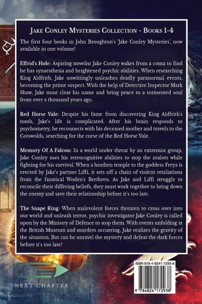 The first four books in John Broughton's 'Jake Conley Mysteries', now available in one volume! Elfrid's Hole: Aspiring novelist Jake Conley wakes from a coma to find he has synaesthesia and heightened psychic abilities. When researching King Aldfrith, Jake unwittingly unleashes deadly paranormal events, becoming the prime suspect. With the help of Detective Inspector Mark Shaw, Jake must clear his name and bring peace to a tormented soul from over a thousand years ago. Red Horse Vale: Despite his fame from discovering King Aldfrith's tomb, Jake's life is complicated. After his brain responds to psychometry, he reconnects with his deceased mother and travels to the Cotswolds, searching for the curse of the Red Horse Vale. Memory Of A Falcon: In a world under threat by an extremist group, Jake Conley uses his retrocognitive abilities to stop the zealots while fighting for his survival. When a heathen temple to the goddess Freya is erected by Jake's partner Liffi, it sets off a chain of violent retaliations from the fanatical Woden's Brethren. As Jake and Liffi struggle to reconcile their differing beliefs, they must work together to bring down the enemy and save their relationship before it's too late. The Snape Ring: When malevolent forces threaten to cross over into our world and unleash terror, psychic investigator Jake Conley is called upon by the Ministry of Defence to stop them. With events unfolding at the British Museum and murders occurring, Jake realizes the gravity of the situation. But can he unravel the mystery and defeat the dark forces before it's too late?