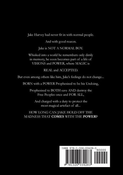 Jake Harvey had never fit in with normal people. And with good reason. Jake is NOT A NORMAL BOY. Whisked into a world he remembers only dimly in memory, he soon becomes part of a life of VISIONS and POWER, where MAGIC is REAL and ACCEPTED. But even among others like him, Jake's feelings do not change... BORN with a POWER Prophesised to be his Undoing, Prophesised to BOTH save AND destroy the Free Peoples once and FOR ALL, And charged with a duty to protect the most magical artefact of all... HOW LONG CAN JAKE HOLD OFF THE MADNESS THAT COMES WITH THE POWER?