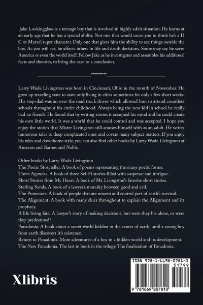Jake Lookingglass is a teenage boy that is involved in highly adult situation. He learns at an early age that he has a special ability. Not one that would cause you to think he's a D C or Marvel super character. Only one that gives him the ability to see things outside the box. As you will see, he affects others in life and death decisions. Some may say he saves America or even the world itself. Follow Jake as he investigates and assembles his additional facts and theories, to bring the case to a conclusion.