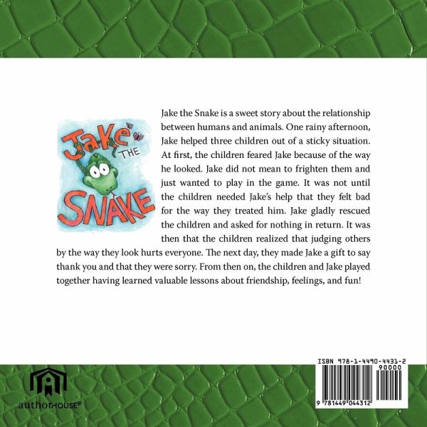 Jake the Snake is a sweet story about the relationship between humans and animals. One rainy afternoon, Jake helped three children out of a sticky situation. At first, the children feared Jake because of the way he looked. Jake did not mean to frighten them and just wanted to play in the game. It was not until the children needed Jake's help that they felt bad for the way they treated him. Jake gladly rescued the children and asked for nothing in return. It was then that the children realized that judging others by the way they look hurts everyone. The next day, they made Jake a gift to say thank you and that they were sorry. From then on, the children and Jake played together having learned valuable lessons about friendship, feelings, and fun!
