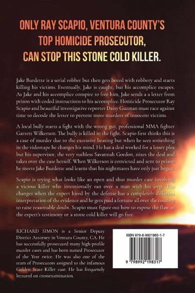 Only Ray Scapio, Ventura County's top homicide prosecutor, can stop this stone cold killer. Jake Burdette is a serial robber but then gets bored with robbery and starts killing his victims. Eventually, Jake is caught, but his accomplice escapes. As Jake and his accomplice conspire to free him, Jake sends a a letter from prison with coded instructions to his accomplice. Homicide Prosecutor Ray Scapio and beautiful investigative reporter Daisy Guzman must race against time to decode the letter to prevent more murders of innocent victims. A local bully starts a fight with the wrong guy, professional MMA fighter Garrett Wilkerson. The bully is killed in the fight. Scapio first thinks this is a case of murder due to the excessive beating but when he sees something in the videotape he changes his mind. He has a deal worked for a lesser plea but his supervisor, the very ruthless Savannah Gordon, nixes the deal and takes over the case herself. When Wilkerson is convicted and sent to prison he meets Jake Burdette and learns that his nightmares have only just begun. Scapio is trying what looks like an open and shut murder case involving a vicious killer who intentionally ran over a man with his jeep. This changes when the expert hired by the defense has a completely different interpretation of the evidence and he gets paid a fortune all over the country to raise reasonable doubt. Scapio must figure out how to expose the flaw in the expert's testimony or a stone cold killer will go free.